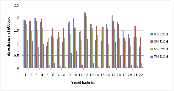 Ethanol tolerance of yeast isolates was determined by using YX liquid medium supplemented with different ethanol concentration (0%, 3%, 5% and 7%). With the initial optical density of 0.1, yeast isolates were inoculated and then incubated at 37°C for 48hours and the medium was used as control for respective concentration. Each cell density was measured by spectrophotometer at 600nm.16