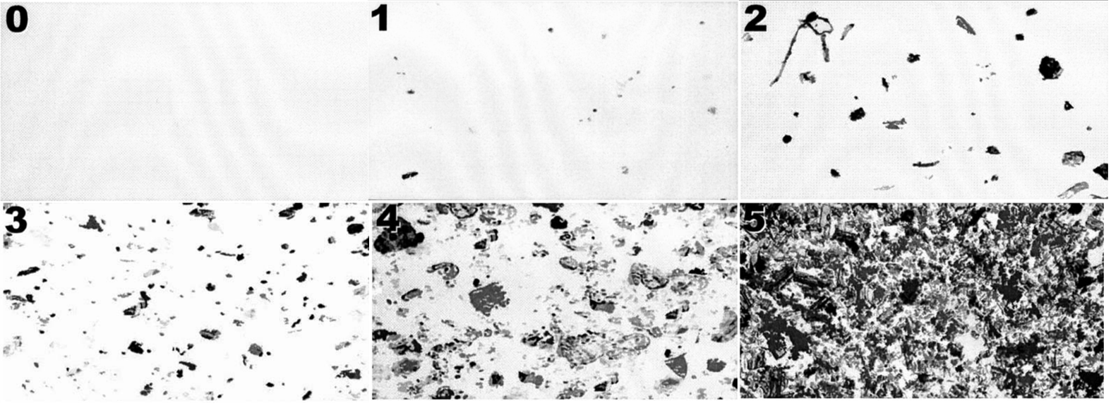Use of image analysis software on the example images provided in the ASTM D7391 standard33 revealed that the actual measured debris loading did not match with the ranges indicated. It should be noted that the same images are used in both ASTM standards D7391 and D7658.30,33 The measured values for images are shown in Table 1. Of the six images (Figure 3) three of the measured values were not in the designated ranges at all (images 3,4,5) (Figure 2); two were at the bottom 1% of the range indicated (1,2) (Figure 2); and one matched (0) (Figure 2) – however this image did not have any debris present to quantify and may not be relevant data. It should also be noted that the images from ASTM D7391 contained numbers in the top left of each image which were counted by the software and may cause slight positive bias to the measurement. However, from the quantification of the numbers in example images ranging from 0.37-0.61%, the positive bias to the calculation is unlikely to exceed 1% of each image.