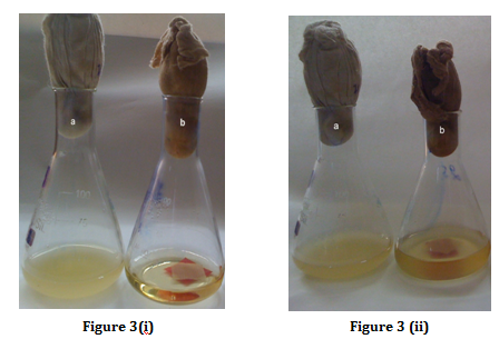 Figure 3 Flasks containing silver nanoparticles impregnated fabrics showing inhibition against (i) Klebsiella pneumoniae and (ii) Bacillus subtilis after overnight incubation.