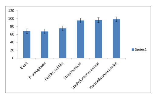 The treated fabrics showed good antibacterial properties against both Gram-positive and Gram-negative bacteria. The results showed excellent antibacterial reduction ratio of the selected bacterial strains ranging from 66.7% to 98.3% for the fabrics treated. The antimicrobial efficacy has been observed even after 20 washes in the treated fabrics. Good antimicrobial activity has been observed against E. coli, Pseudomonas aeruginosa, Streptococcus, S. aureus and K. pneumoniae (Table 1). The flasks containing silver nanoparticles impregnated fabrics showed the inhibition against (i) Klebsiella pneumoniae and (ii) Bacillus subtilis after overnight incubation (Figure 3). The percent inhibition was found 98.3 % and 75%. Figure 4 is showing the bacterial growth inhibition by silver nanoparticles impregnated on silk fabrics with standard error. All the experiments were done in triplicates.
