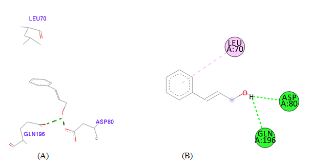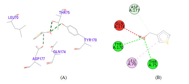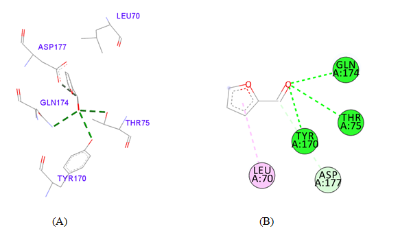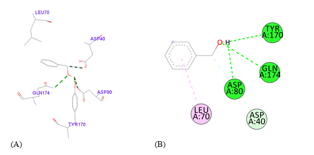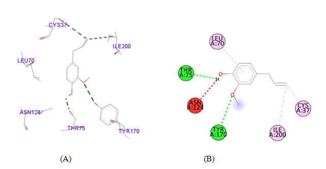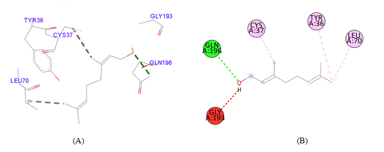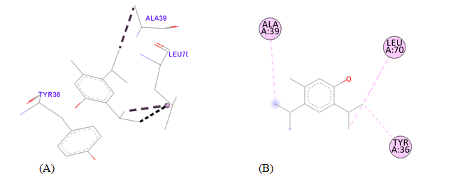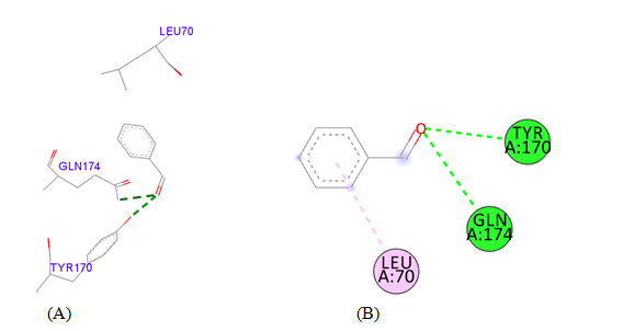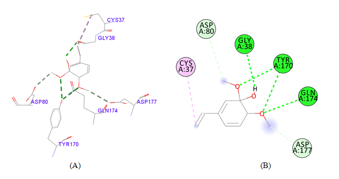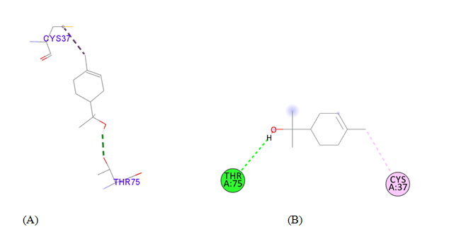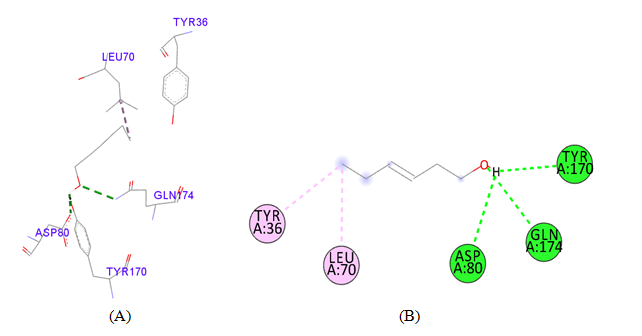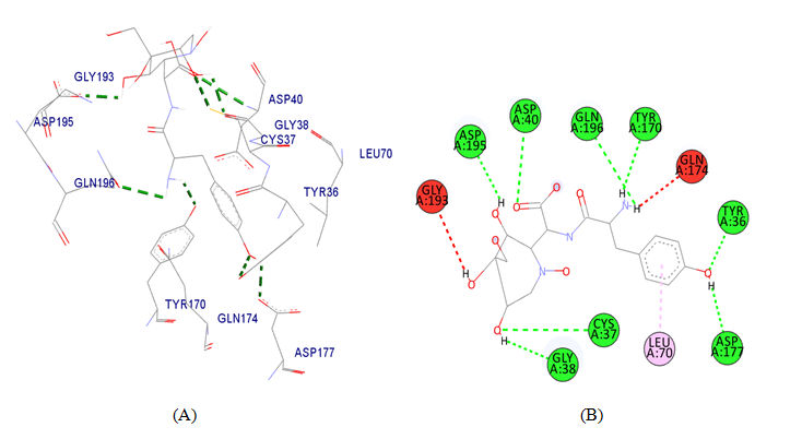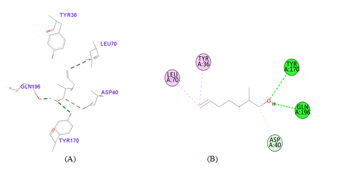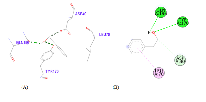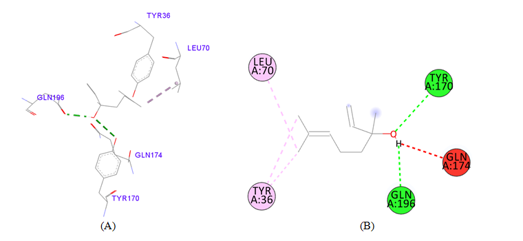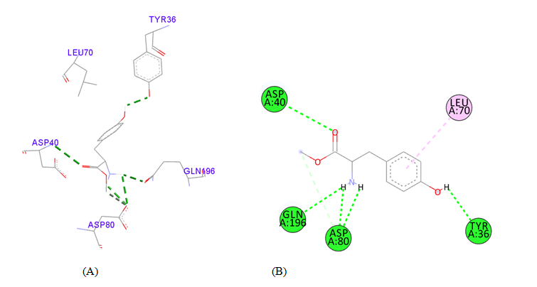gigantea flower extract naturals compounds, the physiochemical analysis and RO5 analysis shows that all those compound having >500 MW, >10 number of rotatable bonds (RB), hydrogen bond donor and acceptor >5 bonds and logP value is >3 all the properties showing these compounds are good for bioavailability of the drug.6‒8,14,15 The predicted ligand binding site for S. aureus TyrRS protein showing pocket residues 36-54, 70-91, 170-196 and 221-241.18,19 Using docking analysis, the natural compounds against S. aureus TyrRS having top 5 docking scores compounds are 2,4-dimethylacetophenone (-6.8), L-Tyrosine_Methyl_ester (-6.7), 3-Phenyl-2-propenoic_acid (-6.6), 2-Methoxy-4-vinylguaiacol (-6.5) and α-Terpineol (-6.5).20,21,23 Protein-ligands interaction studies of S. aureus TyrRS ternary complexes with natural compounds as the putative inhibitor. In complex file interaction studies showing all these natural compounds closely interacted with active sites /substrate binding domains. The interaction residues of the ternary structure of S. aureus TyrRS protein are Tyr36, Cys37, Gly38, Ala39, As40, Leu70, Asp80, Thr75, Tyr170, Gln174, Asp177, Gly193, Asp195, Gln196, Ile 200. This interaction study confirmed that there was the involvement of Hydrogen bond (H-bond), Carbon-Hydrogen bond (C-H bond) and Pi-Alkyl bond. The interaction study showing the strong interaction between S. aureus TyrRS protein with natural compounds but the L-Tyrosine_Methyl_ester docking showing the maximum four hydrogen bond interaction with TYR36, ASP40, ASP80 and GLN19 residues and al the residues are closely interacted with active sites.26‒29 The outcome was determined that the phytocompounds of C. gigantea can be used as a natural better therapeutic target for antimicrobial resource and therefore targeting natural compounds might be an advantageous step in the direction of therapeutic development.