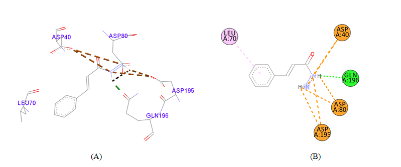 The interaction investigations of the protein-ligand complexed files perception were finished by PyMOL programming 1.3 variant. PyMOL can create large 3D picture of small atoms and protein. The polar (hydrogen bond) and non-polar connections among receptor and little ligand(s) were pictured by PyMOL programming. For binding investigation of the 2D cooperation, this was done by Discovery Studio 2019 (BIOVIA).26‒29