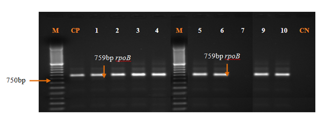 The rpoB DNA was amplified using the following protocol: initial denaturation at 94˚C for 3 min, followed by 35 cycles of denaturation at 94˚C for 1min, annealing at 58˚C for 1 min and extension at 72˚C for 2 min, with a single final extension of 7 min at 72˚C. Amplification was performed with 10µl of PCR products which were separated in 1.5% agarose gel for 30 min at 120V. After amplification, the agarose gel was put in ethidium bromide (0.5μg/ml) and detected by Molecular Imager Gel DocTM EZ (Bio-Rad, USA).