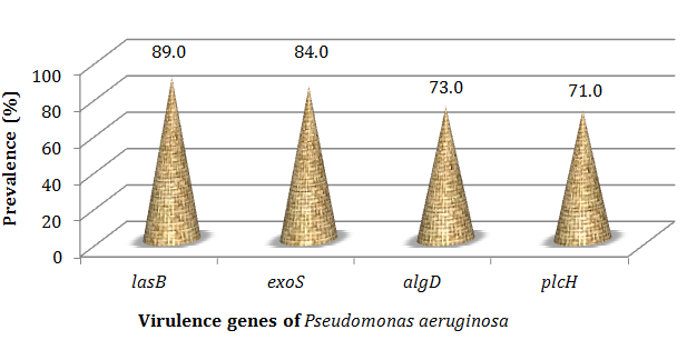 Figure 2 to Figure 4 showed that all the virulence genes studied in this study were detected in the 100 strains of Pseudomonas aeruginosa. According to the Figure 2 and Figure 3 lasB gene with 89.0% has been most detected following by exoS (84.0%). The prevalence of algD and plcH gene was respectively 73.0% and 71.0% (Figure 2 & Figure 4).