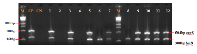 Figure 3 Electrophoretic profile of amplification products of virulence genes exoS and lasB in analyzed products. Virulence genes were present in analyzed products, Lane 1,3,5,7,9,10,11 and 12: exoS and lasB; Lane 6 and 8: lasB; Virulence genes were absent in analyzed products, Lane 2 and 4. M: Marker Gene Ruler 250 bp (Bench Top, 1kb DNA Ladder, Promega Corporation, USA); lasB, elastase LasB-encoding gene; exoS, exoenzyme S-encoding gene.