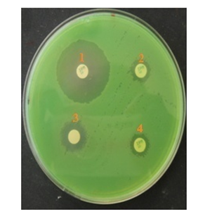 The test showed difference of ≥ 7mm between the inhibition zone diameter of the IPM-EDTA disk and that of the IPM (10μg) alone disk. The test was considered to be positive for producing of MBLs. Imipenem (IPM); 1: IMP disks (10μg) + 4μlEDTA (0.5 M, pH 8); 2: IMP disks (10μg) without EDTA (0.5 M, pH 8); 3: non-impregnated disk+ 10μlEDTA (0.5 M, pH 8); 4: IMP disks (10μg) without EDTA (0.5 M, pH 8).