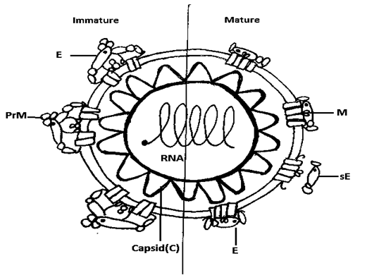 Dengue virus is a member of the genus Flavivirus belonging to Flaviviridae family. The other important human pathogens of the same genus are: yellow fever (YFV), West Nile (WNV), Japanese encephalitis (JEV), and tick borne encephalitis (TBEV). The dengue virus is roughly spherical in shape.10 The mature viron has structural proteins which includes the capsid (C), the membrane (M) and the envelope (E) proteins (Figure 1). The single standard RNA genome of the virus is surrounded by multiple copies of Capsid protein which forms the viral nucleocapsid (Figure 2). The M and E proteins are anchored in nucleocapsid surrounded by host cell derived lipid bilayer.