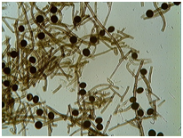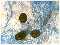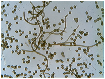 Mycelium septate, branched, brown in colour. Conidiophore short, ampiliform, somewhat brown in colour, bearing single conidium at the tip. Conidia borne singly at the tip of the 113 conidiophores, globose or somewhat flattened, absolutely opaque black, with hyaline membrane on the upper side 24-28×21-24μm.