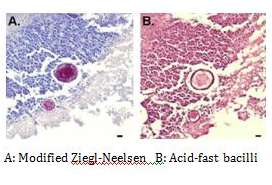 For diagnostic testing, a small sample of one of the patient’s skin ulcers was obtained and sent for histopathologic analysis; the granulomas confirmed the diagnosis of M. marinum. The culture of the lesions also revealed acid-fast bacillivia Ziehl-Neelsen Figure 2 and Fite stains acid-fast preparations. “M. marinum is a nonmotile acid-fast bacillus (AFB) that grows in 2-3 weeks, with optimum growth on Lowenstein-Jensen medium at 30˚C”.7