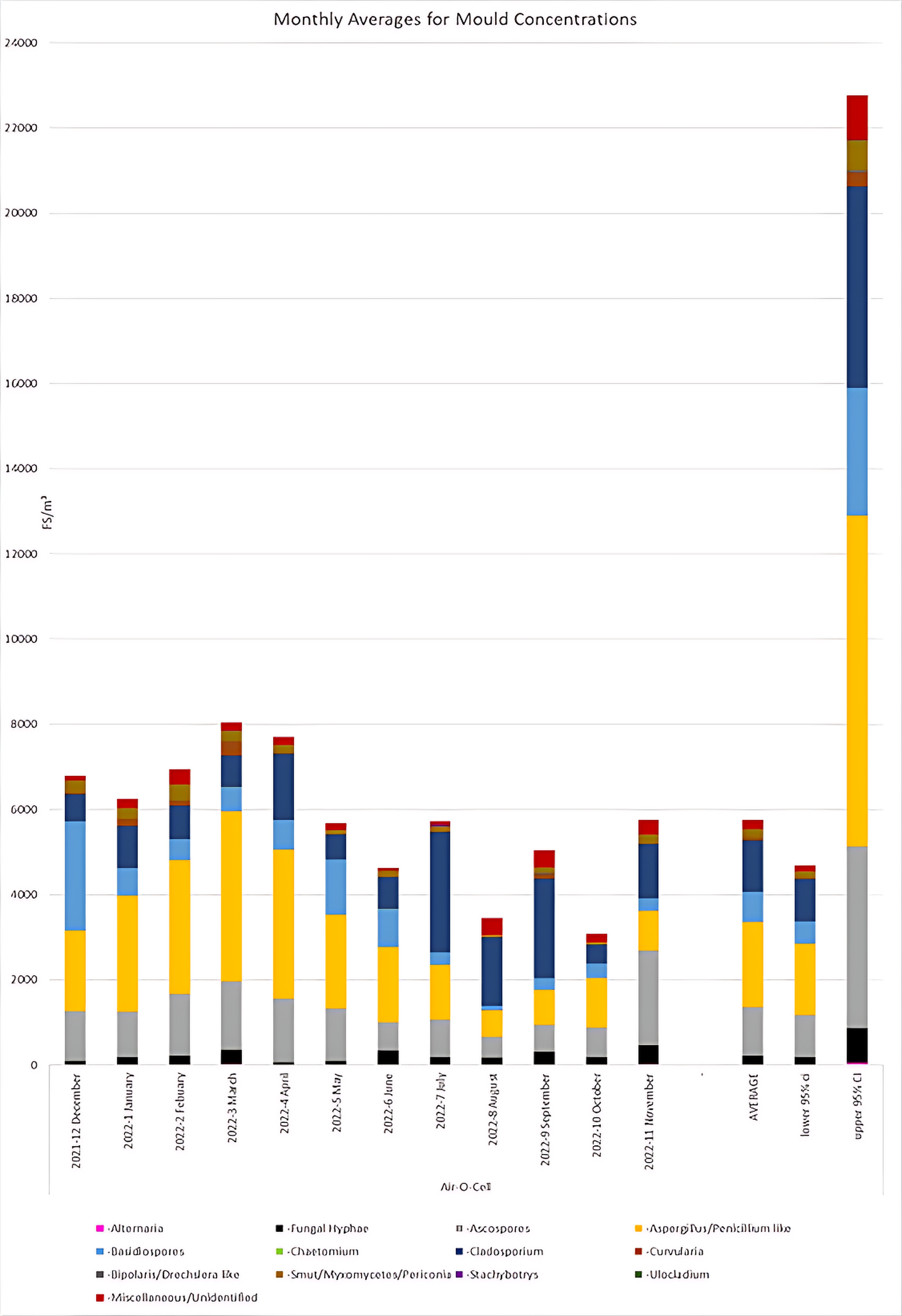 In order to provide insight into typical mould concentrations in outdoor reference samples collected in Queensland, Australia, multiple data points from each month were collected and analysed, to determine mould counts and composition. Monthly averages of mould concentrations were determined using a minimum of 38 data points from each month. The compiled monthly average data is presented in Figure 1. These data indicated that the highest mould concentrations were observed in February, March and April months; and the lowest in August and October. Our data indicate that typical outdoor mould concentrations in Queensland average at approximately 6000 FS/m³ and typically range from approximately 4000-22000 FS/m³. Aspergillus/Penicillium like spores were the most commonly observed spore type in the months of January through to June, and October. Cladosporium were the most common spore type in the months of July to September. Ascospores were the most common spore type in November. Basidiospores were the most common spore type in December 2021.