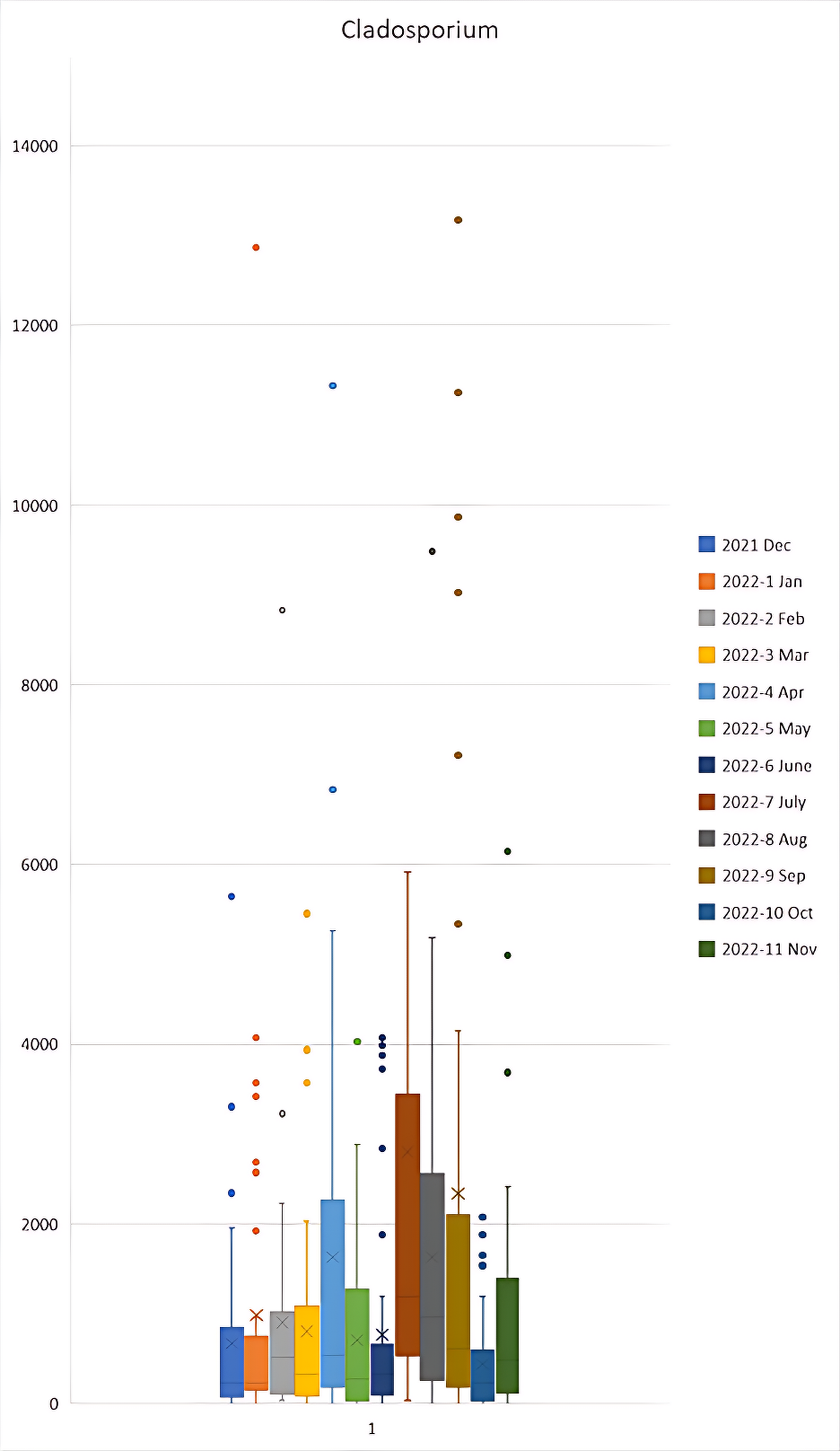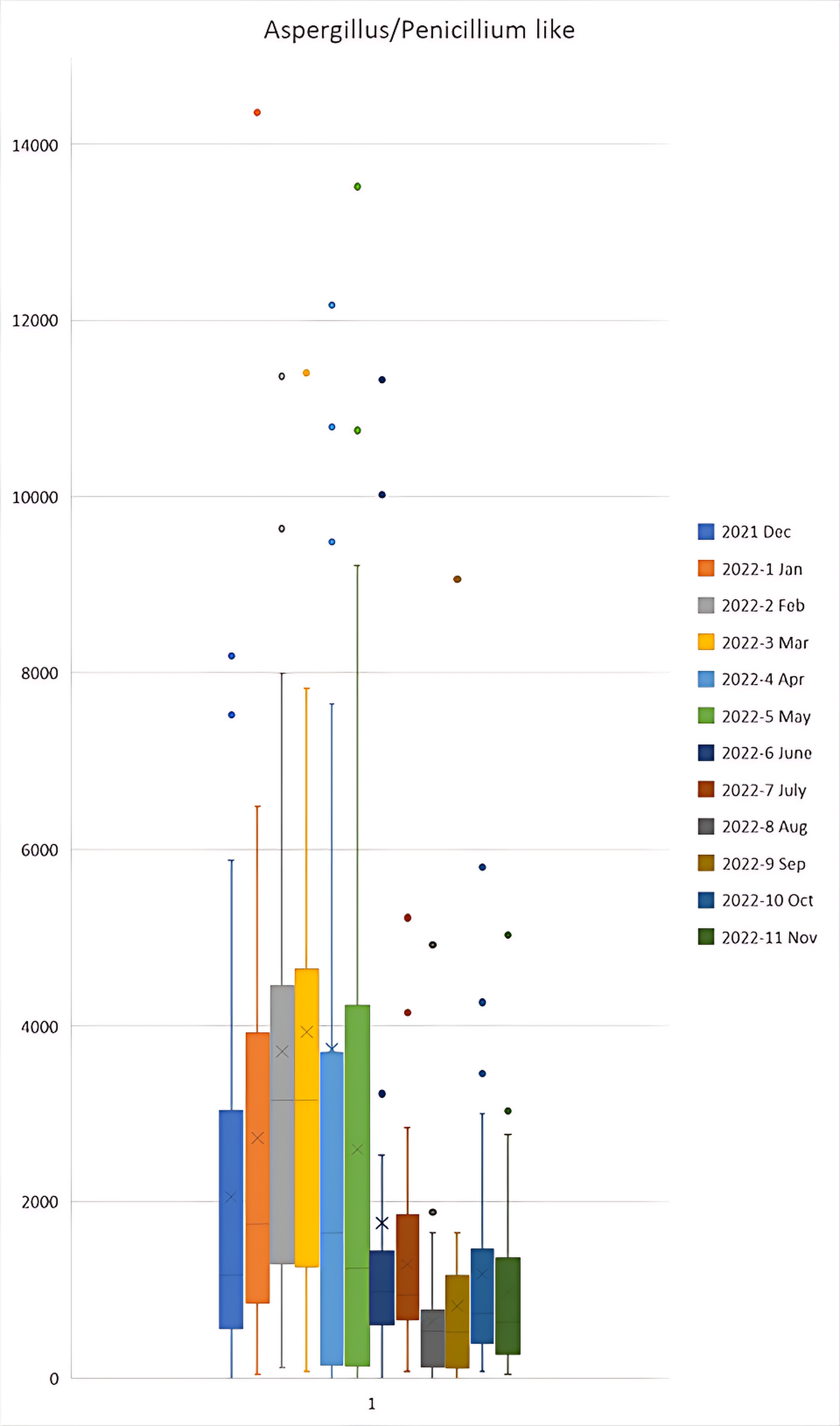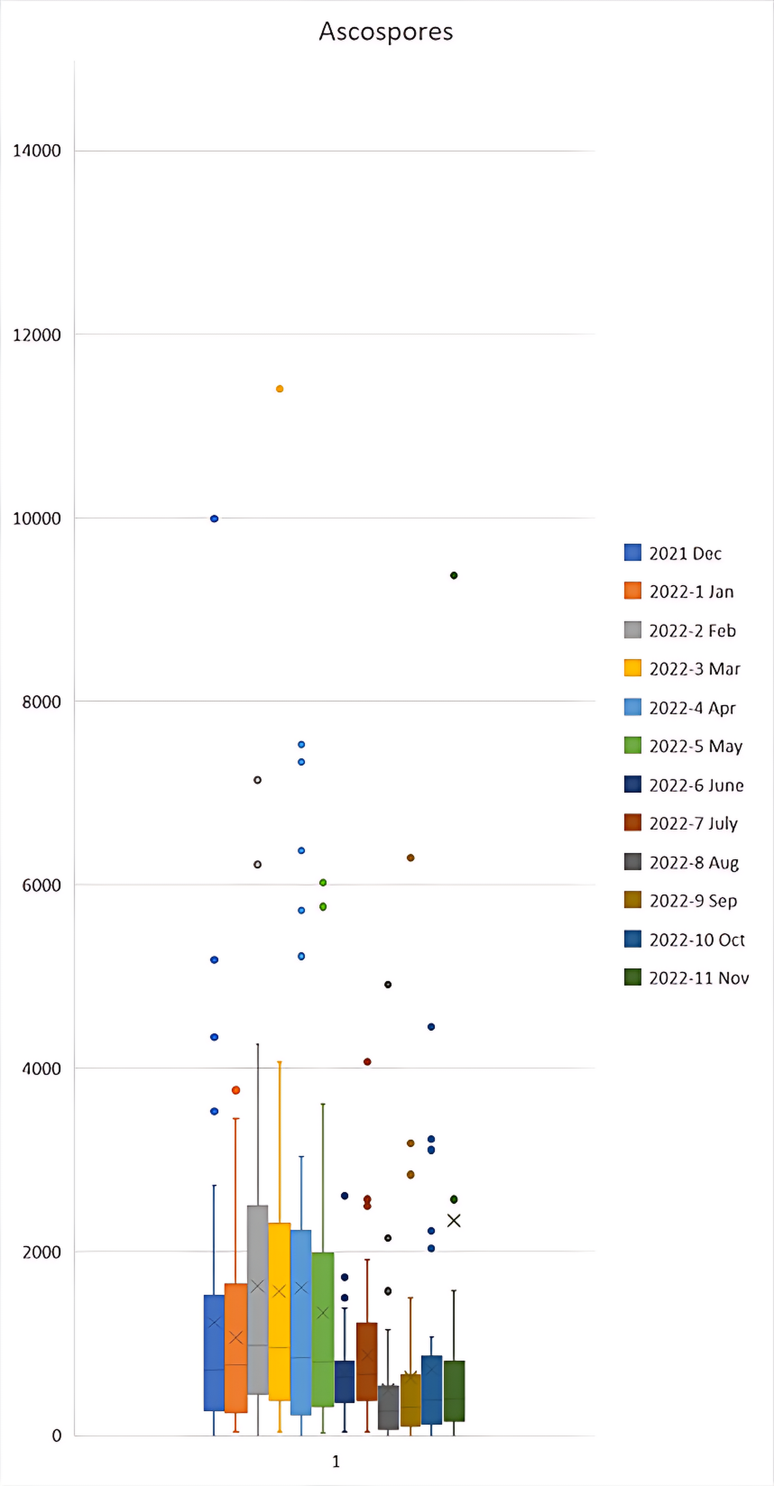 Box and whisker plot for ascospores FS/m³ during the December 2021 to November 2022 period. Outliers were present in the 2022-7 Jul sample of 15,283 and 33,408; and 2022-11 Nov of 15,897 which are not shown on the graph to maintain a functional scale. N = 38.