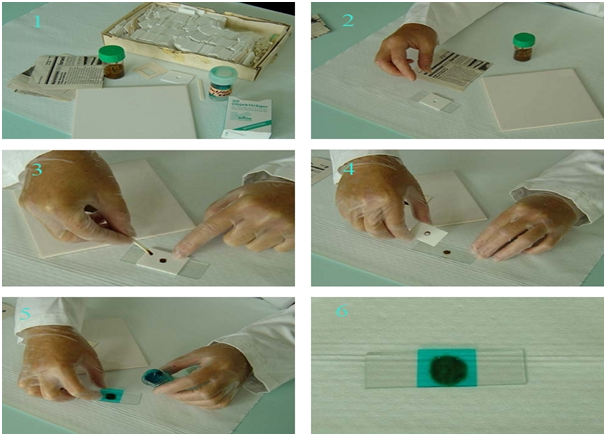 Figure 2 Preparation of Kato Katz slides (Step 1: All the required tools are accommodated; Step 2: Setting up the slide and plastic strip with pit; Step 3: Placement of required quantity of stool in the pit; Step 4: Removal of the plastic strip and desired amount of stool remained in the glass slide; Step 5: Placing the nylon screen over the stool sample; Step 6: Slide prepared and ready for ova counting under microscope).