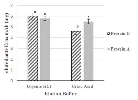 Figure 2 Anti-Erns mAb elution in both matrixes (nProtein-A Sepharose y nPrtotein-G Sepharose) at pH 3.0. Different letters imply significant differences between both buffers for each matrix respectively, according to independent samples t.