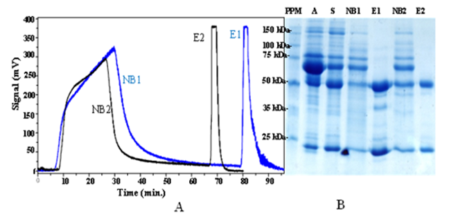 Figure 4 A: Chromatograms corresponding to nSepharose 4Fast Flow with protein A (in blue) and protein G (in black) without ammonium sulfate precipitation. B: SDS-PAGE. PPM: standard molecular weight. NB1: Not bound fraction in protein G affinity chromatography. NB2: Not bound fraction in protein an affinity chromatography. E1: Eluted fraction in protein G affinity chromatography. E2: Eluted fraction in protein an affinity chromatography.