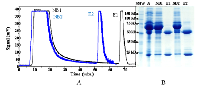 Figure 3 A: Chromatograms corresponding to nSepharose 4 Fast Flow with protein A (in blue) and protein G (in black) with ammonium sulfate precipitation. B: SDS-PAGE of different fractions. SMW: standard molecular weight. NB1: Not bound fraction in protein G affinity chromatography. NB2: Not bound fraction in protein an affinity chromatography. E1: Eluted fraction in protein G affinity chromatography. E2: Eluted fraction in protein an affinity chromatography.