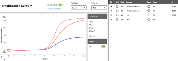 We have amplified the positive control provided in the peanut allergen detection kit (DSS-PN-011, DSS Imagetech Pvt Ltd., India). DNA extracted from raw peanut was also amplified to validate the kit and the amplification peak was shown in Figure 1 and the respective melt curve shown in Figure 2. Out of the 17 food samples only 6 food samples (Cookie I, Protein cookie, Potato chips I, Aloo bhujia, Schezwan sauce and Badam pak) were tested for presence of peanut allergen (Table 1, Figure 3).