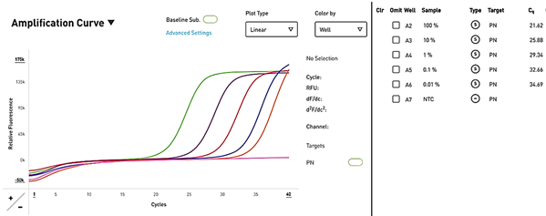 The sensitivity test or limit of detection (LOD) of the assay was also performed using real-time PCR for the detection of peanut allergens in various chosen food samples. For this the DNA (50 ng/µL) was diluted in different dilutions: 100%, 10%, 1%, 0.1%, 0.01%. The DNA was serially diluted. The total volume was 50 µL. The qPCR reaction was performed as per above dilutions using the same reaction setup and thermal profile. Spiking of peanut powder was performed in maize flour. We generated mixtures with final weight of 200 mg that ranged from 1, 5, 10, 20, 30, 40, 50 mg of peanut powder in maize flour.