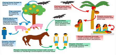 Etiology: Nipah virus was first identified in Malaysia in the year 1978 and considered to be a variant of Japanese Encephalitis it is so called after the village of “SungaliNipah” where it was first identified. Nipah is an envelope, negative sense, single-stranded RNA virus, with a genome sequence size of about 18,000 nuclcotides. NiV genome organization comprises six major genes present in all Paramyxovirus. Fruit bats (Macrochiroptera) of the family Pteropodidae particularly species belonging to the Pteropus genus- are the natural hosts for Nipah virus.7