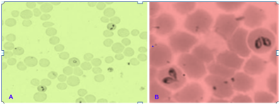 Babesia bovis is a small parasite, usually centrally located in the erythrocyte. It measures approximately 1-1.5μm long and 0.5-1.0μm wide, and is often found as pairs that are at an obtuse angle to each other. While, Babesia bigemina is a much longer parasite, and is often found as pairs at an acute angle to each other. Babesia bigemina is typically pear-shaped, but many diverse single forms are found. It is 3-3.5μm long and 1-1.5μm wide, and paired forms often have two discrete red-staining dots in each parasite (B. bovis and B. divergens always have only one) (Figure 1 & 2).15