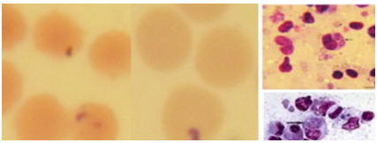 The piroplasm forms in the red blood cells more commonly occur as round, oval, or ring shaped (0.5-1.5µm) forms. Rod, comma (1.6µm) shapes and anaplasma - like organisms may also be found, the latter measuring 0.5µm. Macroschizonts and microschizonts are found in the lymphocytes of the spleen and lymph nodes, that are known as schizonts (Koch's blue bodies), being circular or irregularly shaped structures about 8µm in diameter, but vary from 2 to 12µm or more. Two forms of schizonts are recognized, those which contain large chromatin granules (0.4-2µm in diameter with a mean of 1.0µm) that are referred to as macroschizonts and produce macromerozoites (2-2.5µm diameter). The other forms contain smaller chromatin granules (0.3-0.8µm in diameter with mean of 0.5µm) and are referred to as microschizonts that produce micromerozoites (Figure 4 & 5).24