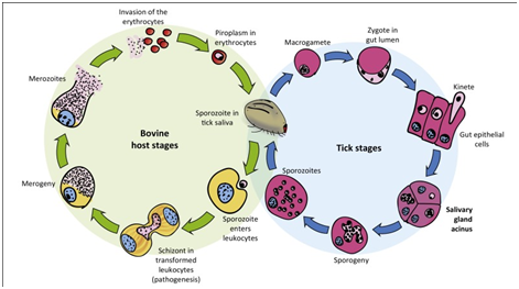 Theileria species, tick transmitted, intracellular protozoan parasites infecting leukocytes and erythrocytes of wild and domestic large and small ruminants. In cattle: T. parkas, T. annulata, T. mutans, T. velifera, T. tarurotragi and T. buffeli.22 T. annulata and T. parva are considered to be the most pathogenic species of Theileria affecting cattle.23