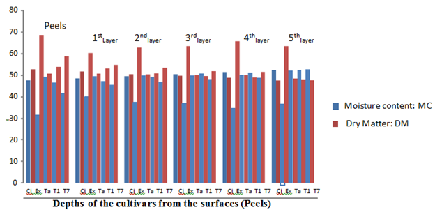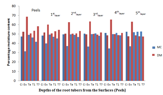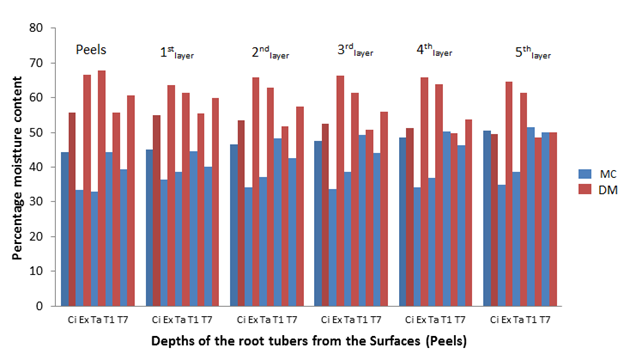 Figure 1 The percentage moisture content and dry matter of the root tubers at different depths from the sources before storage.