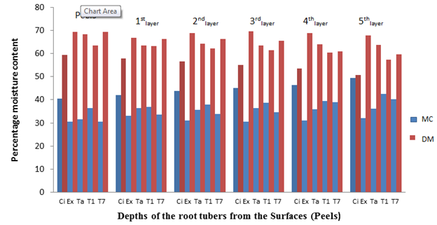 Percentage MC on wet weight basis of the peels and 5 different layers (depths) of the stored root tubers slices were determined fort-nightly. Each root tuber was washed, peeled; the underlining flesh was held in a longitudinal position on top of a chop board then sectioned into 5 layers (depths), each 5cm thick towards the centre of its circumference. The peels and the 5 layers (depths) were chopped into chips (slices) which were analysed for moisture content as follows: