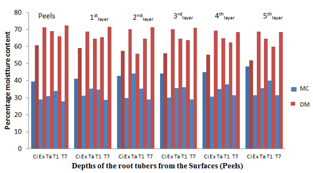 Figure 3 The percentage moisture content and dry matter of the root tubers at different depths from the surfaces after 4 weeks of storage.
