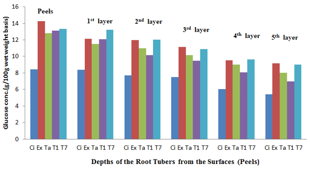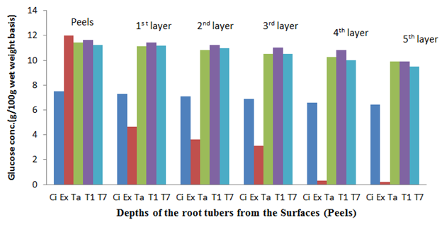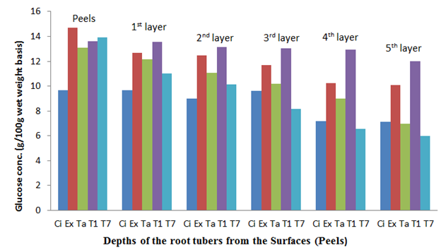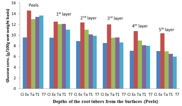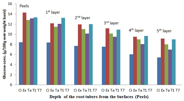 Figure 6 The glucose content of the sweet potato root tubers at different depths from the surfaces (Peels) before storage.