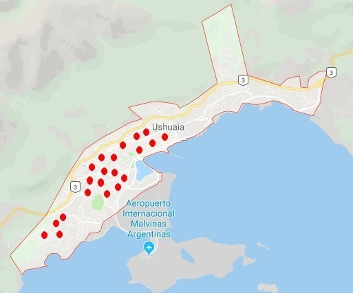 A total of 93 butcher shops were identified in the island. The distribution of butchers from each city in TDF was 21 in Ushuaia, 5 in Tolhuin and 49 in Rio Grande city (Figures 2‒4). Two O157:H7 serogroup out of 93 samples were detected by immunoabsorption. After IMS and subsequent PCR screening, the Shiga toxin genes were not detected. In both routes of the 93 samples analyzed, STEC O157 and STEC non-O157 were not detected. According to serogroup detection by immunoabsorption test, 2.15% of the ground meat samples from TDF were suspected of O157 non-STEC.