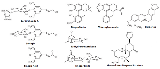 The different classes of compounds which are found in this plant are classed in groups like alkaloids, steroids, terpenoids, polysaccharides, glycosides and different aromatic and aliphatic compounds that are present in their phytoactive form that are responsible for the wide range of medicinal and therapeutic properties. The presence of these compounds is found in various plant parts but highly concentrated in the stem, leaves and root part of the plant.5 The main compound of this plant is berberine and furanolactone and furthermore compounds like tinosporone, tinosporic acid, cordifolisides A to E, giloin, gilenin, crude giloininand, arabinogalactan polysaccharide, picrotene, bergenin, gilosterol, tinosporol, tinosporidine, sitosterol, cordifol, heptacosanol, octacosonal, tinosporide, columbin, chasmanthin, palmarin, palmatosides C and F, amritosides, cordioside, tinosponone, ecdysterone, makisterone A, hydroxyecdysone, magnoflorine, tembetarine, syringine, glucan polysaccharide, syringine apiosylglycoside, isocolumbin, palmatine, tetrahydropalmaitine, jatrorrhizine are few of the compounds that have been iolated from the plant. The presence of three compounds like cycloeuphordenol, Cyclohexyl-11-heneicosanone and 2-Hydroxy-4-methoxy-benzaldehyde has been isolated from the plant and has been seen to be present in various other plants. The presence of proteins and miscellaneous compounds has been attributed to the medicinal properties of the plant6,7 (Table 1 & Figure 4).