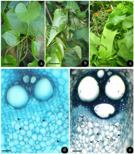 The Tinospora cordifolia plant had been appreciated to high levels for the medicinal, therapeutic, curative, healing and relieving nature. Though the plant has a strong defense against microorganisms, pests and insects, the plant in itself is not invincible and is bound to be affected by various diseases and one of the diseases that prominently affect the plant have been mentioned below. The new flat stem disease that infects the branches and the infected plant bears small leaves and it was observed that the same nodal region bears multiple new leaves ranging to about 20 to 30 in number and the older leaves are fewer in number and compared to normal plant the internodal region is shorter in the winter and the causal organism of this disease is phytoplasma. The differences in the infected and normal plant is not just restricted to the physical appearance but the irregular arrangement the phloem and xylem systems are visibly observed and the sieve components and the vascular bundle bear altering arrangements to the normal cells27 (Figure 5).