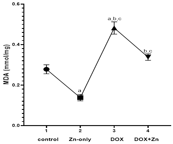 Figure 1 MDA (mmol/mg) levels in all experimental groups (n=5); a = significance when compared to group 1 (control), b = significance when compared to group 2 (Zn-only), c = significance on comparison between group 3 (DOX) and group 4 (DOX+Zn).
