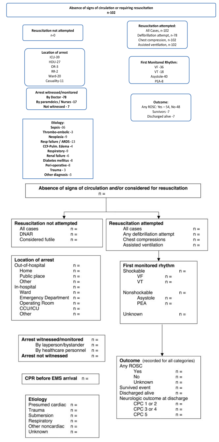 Figure 1 The various parameters and outcome of cardiac arrest. ICU, intensive care unit; HDU, high dependency unit; OR, operating room; RR, Recovery Room (postoperative); CCF, congestive cardiac failure.
