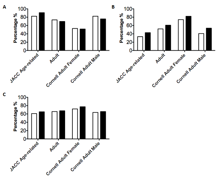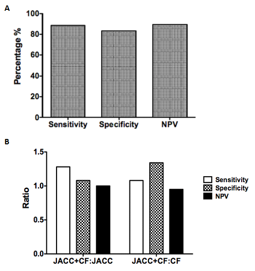 Our next scenario of interest involved amalgamating ECG voltage criteria. As Cornell Adult Female criteria exhibited the highest sensitivity, we decided to use this criterion as a screening tool. We then applied JACC Age-related criteria (bearing the highest specificity) to these events and analyzed sensitivity, specificity and NPV using to LVH and/or dilatation by echocardiography as our gold standard. Our amalgamated JACC+CF criteria showed a sensitivity of 88.64%, a specificity of 83.33% and a negative predictive value of 89.47% (Figure 3A). These were higher than either JACC or CF criteria alone, with the exception of JACC criteria specificity.