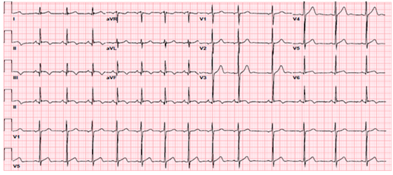 Figure 1B Repeat ECG showed improvement of the initial ST segment and T wave changes, with T wave inversions in leads II, III, aVF.