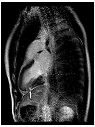 Testing was done for collagen vascular diseases, as well as a Mantoux test, all of which were negative. The patient’s ESR was also within the normal range, consistent with the focal nature of his inflammatory process that did not mount a systemic response. On the third day of hospital admission, the patient’s symptoms had resolved, with normalization of his cardiac enzymes. He was discharged without any new medications, and followed up with a repeat cardiac MRI in two months that showed no abnormalities (Figure 2b). The patient reported no recurrence of his chest pain.