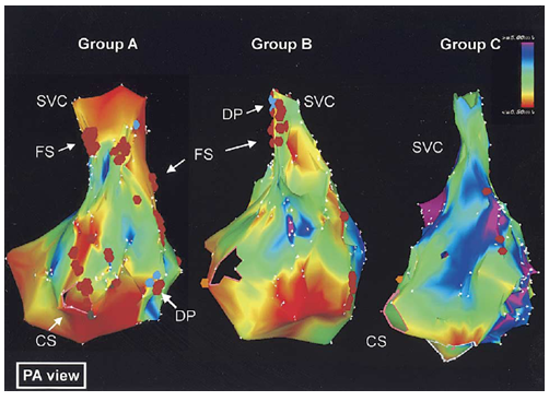 Color annotation is with bipolar voltages of ≤0.5 mV shown in red, through to voltages ≥5 mV shown in purple. Group A had the oldest patients and Group C the youngest ones, and Group B was intermediate. Electroanatomic activation mapping also demonstrated more extensive areas of double potentials and fractionated signals in groups A and B compared with group C. There was a strong correlation between advancing age and increasing double potentials and fractionated signals.