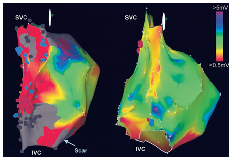 Kistler et al.,38 observed age-related evidence of generalized conduction slowing in the atria both on standard multipolar electrophysiology catheters deployed along the CS and lateral RA and also during electroanatomic mapping. They also found development of increasing numbers of fractionated signals and double potentials in the atrium but particularly along the crista terminal is with advancing age (Figure 3). This fact may be important because functional conduction delay at this structure has been implicated in the development of a range of atrial arrhythmias. Moreover, electro an atomic voltage maps demonstrated significant reduction in voltage amplitude, which may reflect development of atrial fibrosis (Figure 4).38,39 However, in the absence of histological data, the relationship between decreased atrial voltage amplitud and structural change remains merely speculative. The presence of areas of low voltage has been associated with chronic atrial arrhythmias. Aging was associated with not only a significant reduction in voltage but an increase in the heterogeneity of voltage. In a study in goats with chronic AF, Ausma J et al.,40 observed changes in cellular ultra structure without any alteration in tissue structure. In a subsequent study, they demonstrated that these changes had not completely resolved as late as four months after return to sinus rhythm.41 In another study performed in dogs with atrial remodeling due to chronic heart failure,42 it was reported the persistence of local conduction abnormalities and increased AF duration associated with atrial fibrosis as late as five weeks after resolution of left ventricular dysfunction. Therefore, changes in voltage and conduction seen with aging may represent the structural remodeling and fibrosis, which plays an important role in the development of AF.43‒48