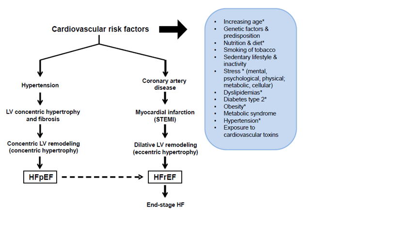 Figure 1 The two main types of cardiac remodeling and the march to heart failure in older patients. The two main co-morbidities in older patients, namely HTN and MI result in 2 divergent types of LV remodeling that lead to 2 distinct types of HF. The inset lists the main known CV risk factors. * Especially pertinent during the progressive aging process and subsequent march to HF.