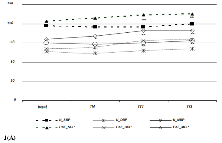 Figure 1 Blood pressure (1A) and heart rate (1B) responses during head-up tilting in patients with paroxysmal atrial fibrillation and in healthy individuals. basal=supine position; TM=during the 15 seconds of tilting movement; TT1=during the first minute of tilting (70º); TT2=during the second minute of tilting (70º); PAF_SBP, PAF_MBP and PAF_DBP=systolic, mean and diastolic blood pressure in paroxysmal atrial fibrillation patients, respectively; N_SPB, N_MBP and N_DBP=systolic, mean and diastolic blood pressure in healthy volunteers, respectively. Data expressed as mean values. (p=NS between HI and PAF patients for basal blood pressure and for RR intervals in each period; *=p£0,01; **=p£0,001).