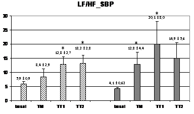 Figure 3 Changes in autonomic outflow parameters obtained from the systolic blood pressure during head-up tilt. basal=supine position; TM=during the 15 seconds of tilting movement; TT1=during the first minute of tilting (70º); TT2=during the second minute of tilting (60º); PAF=paroxysmal atrial fibrillation; HI=healthy individuals; LF_SBP=LF band from systolic blood pressure; HF_SBP=HF band from systolic blood pressure; LF/HF_RR=LF/HF ratio from systolic blood pressure. Data expressed as mean±SEM. (p<0,05 between HI and PAF patients for basal HF and for LF and LF/HF during TM; *=p<0,05 when compared to basal).