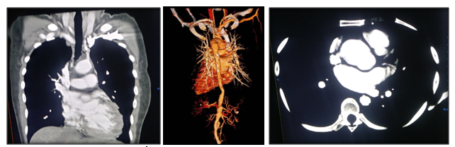 We present the case of a 37-year-old woman who began her cardiovascular history with the detection of an indeterminate heart murmur in the first pregnancy, which was not followed up. In the second pregnancy, she presents severe preeclampsia, since then with chronic arterial hypertension, in follow-up a significant difference in blood pressure between both upper extremities is also detected. She presented deterioration in the functional class and hypertensive uncontrol, so he went to our hospital for assessment by cardiology. To auscultation, with murmur of decreasing holodiastolic aortic epicenter, intensity III / IV irradiated left sternal border; Flint Austin murmur present. Celler carotid pulses, right subclavian path with systolic thrill; intense palpable pulse under right clavicle and supra sternal hollow. Upper limbs with asymmetrical trophism, blood pressure right arm 240/80mmHg, blood pressure left arm 200/80mmHg. Lower limbs with a right lower femoral pulse. Electrocardiogram with sinus tachycardia. (Figure 1)