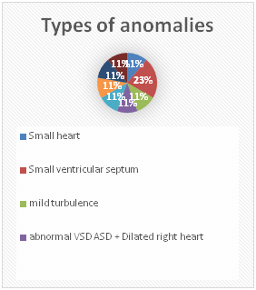 The anomalies found in the 11 affected mothers included: small heart (11%), ventricular septal defect (23%), mild turbulence (11%), abnormal ventricular septal defect and dilated right heart (11%), ventricular hypertrophy (11%), cardiomegaly with dysplastic pulmonary valve and a dilated right heart (11%), Ebstein anomaly (11%) and truncus anomaly (11%) (Figure 3). Out of the 23 diabetic mothers with diabetes type 2, 4 participants had abnormal foetal findings (0.17% out of the population of diabetes type 2, or 0.088% out of the whole population, which was 45 mothers). Moreover, out of the 22 diabetic mothers with diabetes type 1, 7 participants had abnormal findings (0.31% out of the population of diabetes type 1, or 0.15% out of the entire population of 45 mothers).
