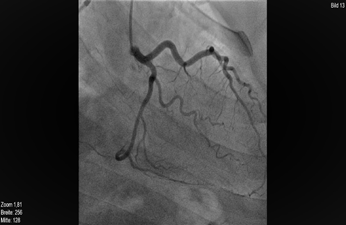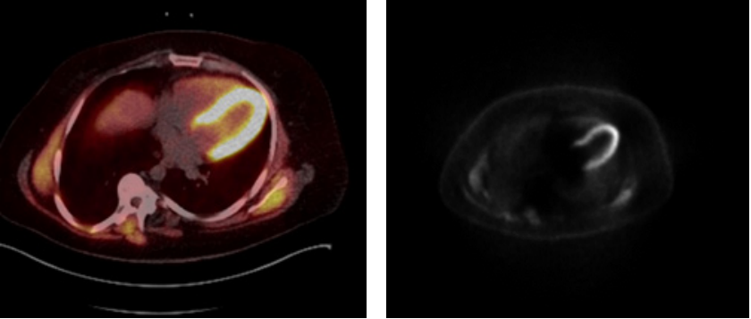 A Positron Emission Tomography (PET–CT (Figure 4) demonstrated no relevant myocardial scar and a Myocardial-Scintigraphy Scan (Figure 5) also failed to demonstrate any evidence of myocardial scarring or ischemia. It was decided in Team Discussion for guideline directed medical therapy (GDMT). Despite of the GDMT, the patient complained of anginal symptoms sometimes even at rest. After 7 weeks of GDMT, the patient presented again to the emergency with recurrent angina (3-4 days) for more than 30 minutes and Angina pectoris (CCS) Canadian Cardiovascular Society grading (class III). The Laboratory investigations revealed raised cardiac enzymes. The transthoracic echocardiogram revealed reduction in the left ventricular ejection function (LVEF of 42%) with mild inferior wall hypokinesia. The case was again re-evaluated in Heart Team Discussion and the option of an operative Revascularisation was given.