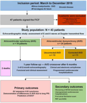 Methodology: Prospective cohort study with patients with permanent DDD pacemakers due to sinus disease associated with first-degree AVB (binodal disease). We analyzed diastolic filling time (DFT), defining 2 groups: patients with AV synchrony (AVS) and AVD. Clinical and echocardiographic follow-up was performed for a year.