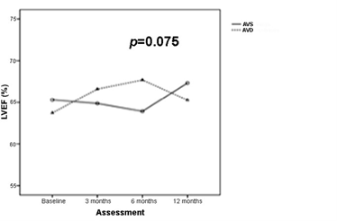 Figure 5 LVEF progression during follow-up after AVD correction. Increasing trend under the influence of oAVi and wide QRS in the AVD group. AVD, AV, dyssynchrony; AVS, AV synchrony.