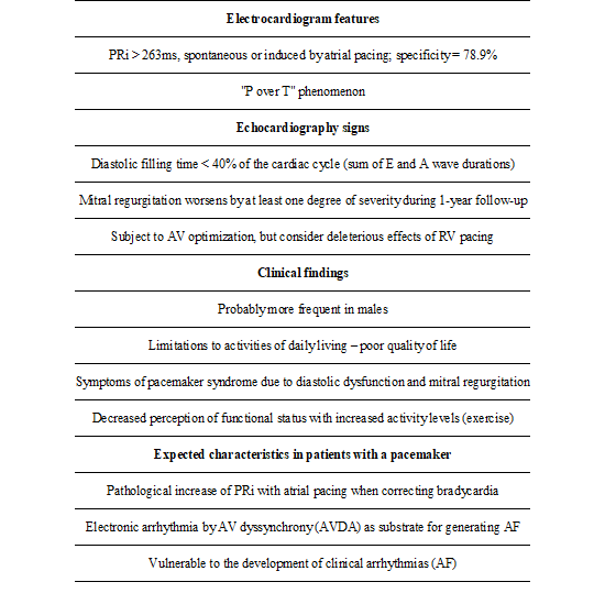 Finally, after a thorough analysis of our results and grouping the characteristics of patients with AVD, mainly determined by the PRi <263ms and compromised diastolic filling (DFT <40% of the cardiac cycle), the existence of a “long PR syndrome” is put into perspective. It would consider a heterogeneous population that stands out by its clinical and electromechanical AV derangement, with repercussions to ventricular function determined by a permissive maintenance of anti-physiological long PRi (> 263ms).1,2
