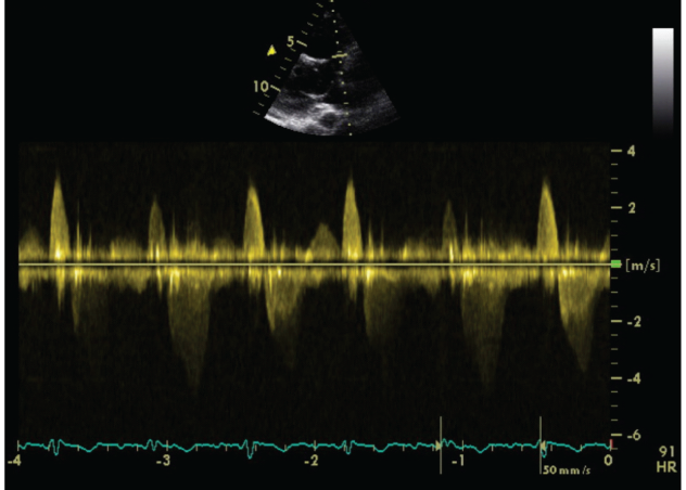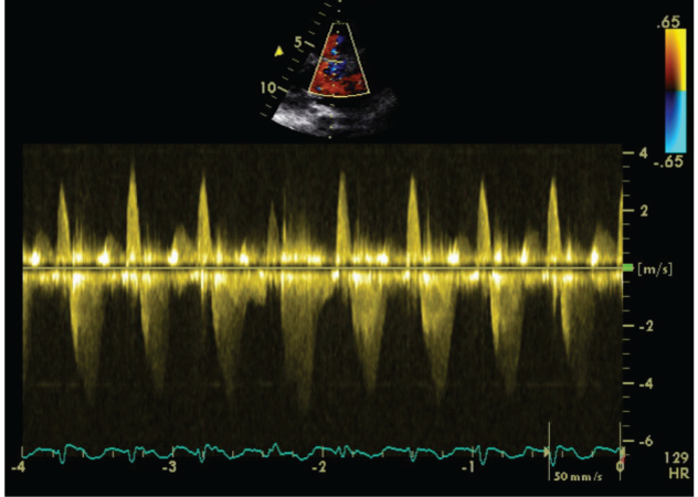 We carried out an Exercise Stress Echocardiogram using a semi-supine bicycle using WHO protocol using a 3-minute step protocol of 20-40 watts at 60-75rpm until volitional fatigue. All basic haemodynamic parameters were recorded at rest and at each stage of exercise (BP, heart rate, Oxygen saturation, electrocardiogram). We assessed his shunt in para-sternal long axis window (PLAX). Consultant cardiologist and senior cardiac physiologist carried out the test. We used colour doppler across interventricular septum to identify the VSD. Once it was identified, we tilted the probe to optimize VSD capture. Sample volume was then placed through VSD to obtain pulsed doppler images at rest (Figure 1). Similar pulsed doppler images were obtained at peak exercise (Figure 2). We did direct shunt volume assessment using velocity time integral (VTI). We averaged all VTIs obtained for five cardiac cycles.