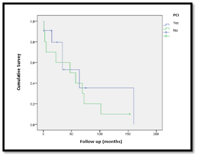 A study conducted in Spain reported significant LV systolic dysfunction (about 25±10%) in the CS no survivor group (Figure 2). They also found multi vessel disease in 25% of cases and left main involvement in 12% cases.9 The IABP-SHOCK II-trial showed that overall EF was about 25%, and left main involvement was 9%.17 These findings are similar to our study, where in the majority of patients having severe LVsystolic dysfunction especially when it was an anterior wall and left main disease, which may have led to high mortality in this study. In the NRMI registry, of the 340 CS patients enrolled, 163 (47.9%) died. Among the expired CS patients, 74 (33.9%) underwent revascularization by PCI, and 63 (34.1%) patients had primary PCI.6